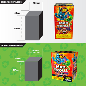 Our waste reduction begins with optimizing product design. We have made product packaging reductions to minimize the amount of material needed while also increasing volumetric efficiency. These improved designs eliminate excess waste without impacting product performance. For fireworks, this means that you still get the same amount of pyrotechnic composition, duration of effects, and uniqueness of effects- but with sustainable packaging.