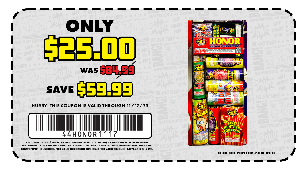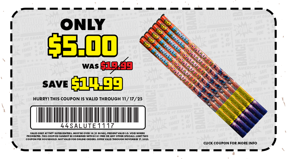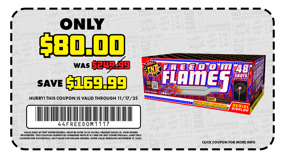 Supercenter Deal of the Week: Purchase 'Freedom Flames' for only $80 each - Save up to $169.99. Valid only at TNT Supercenters. Limit two per purchase, one coupon per household. Limited quantities available. Other restrictions apply, see coupon for details.